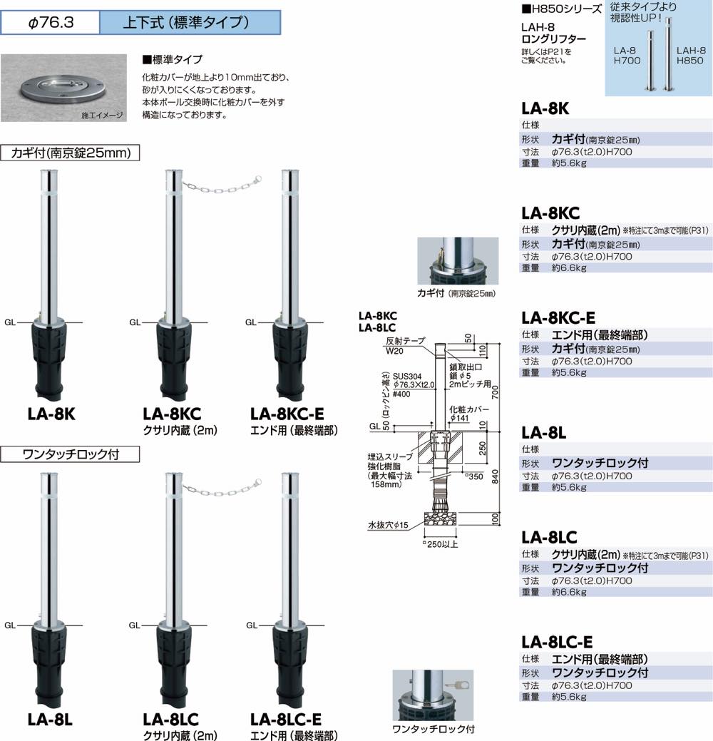 品番: LA-8KC-E 仕様: エンド用(最終端部) サイズ: φ76.3×H700 重量:約5.6kg |
