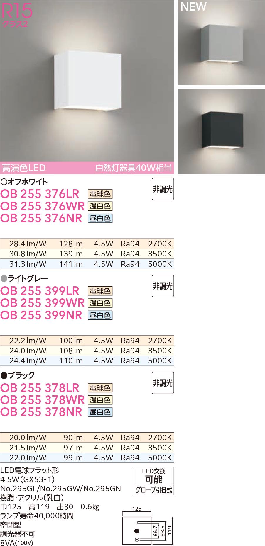 品番: OB255376LR電球色 エネルギー消費効率・色温度: 28.4lm/W 2700K 定格光束・消費電力: 128lm 4.5W |
