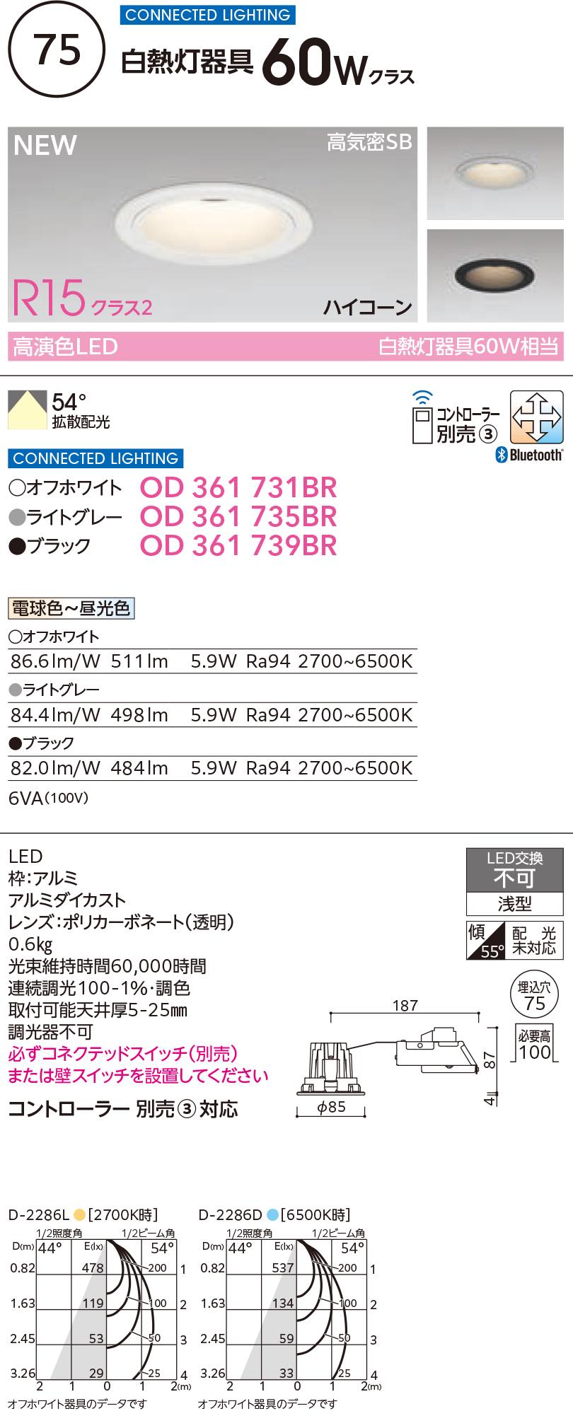 品番: OD361731BRオフホワイト エネルギー消費効率: 86.6lm/W 定格光束・消費電力: 511lm 5.9W |