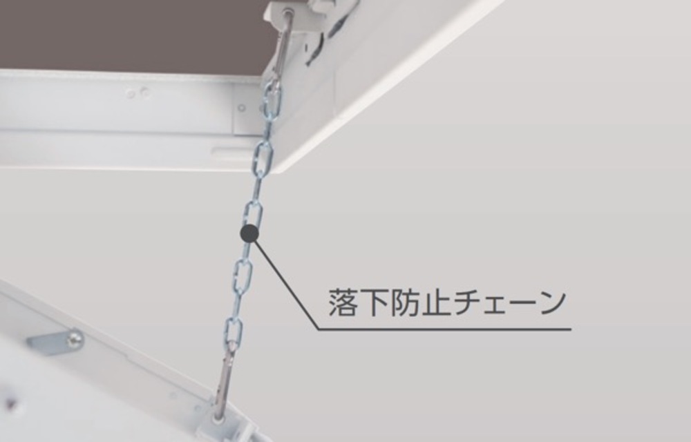本製品は落下防止チェーンが装備されているので、点検時にフタが勢いよく全開するのを防ぎます。