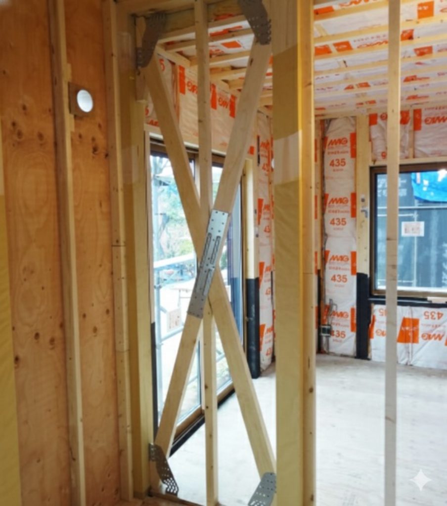地震や強風による揺れに備えて、木造住宅の耐震性を強化する「たすき掛け筋かい」。